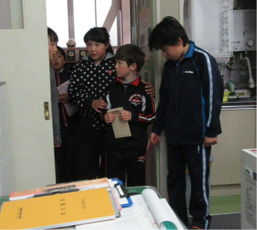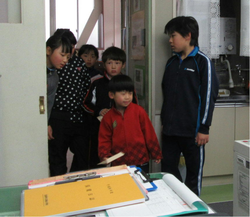 1年生が職員室に入ろうとしています。みんな、学級で練習はしましたが、いざ、本当に入ろうとすると、どのようにして入ったらよいのかよくわからず、どきどきしていました。その姿を見た上級生が、大勢助けに来ました。「○○○って言うんだよ。」「だいじょうぶ。がんばって。」と上級生が励ますと、1年生は勇気を振り絞って、立派に挨拶をして入ってきました。清嶺小の上級生は、本当に優しくて、頼りになります。1年生も、そんな上級生に支えられながら、いろんなことを覚えていきます。