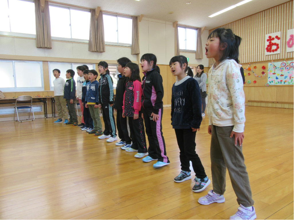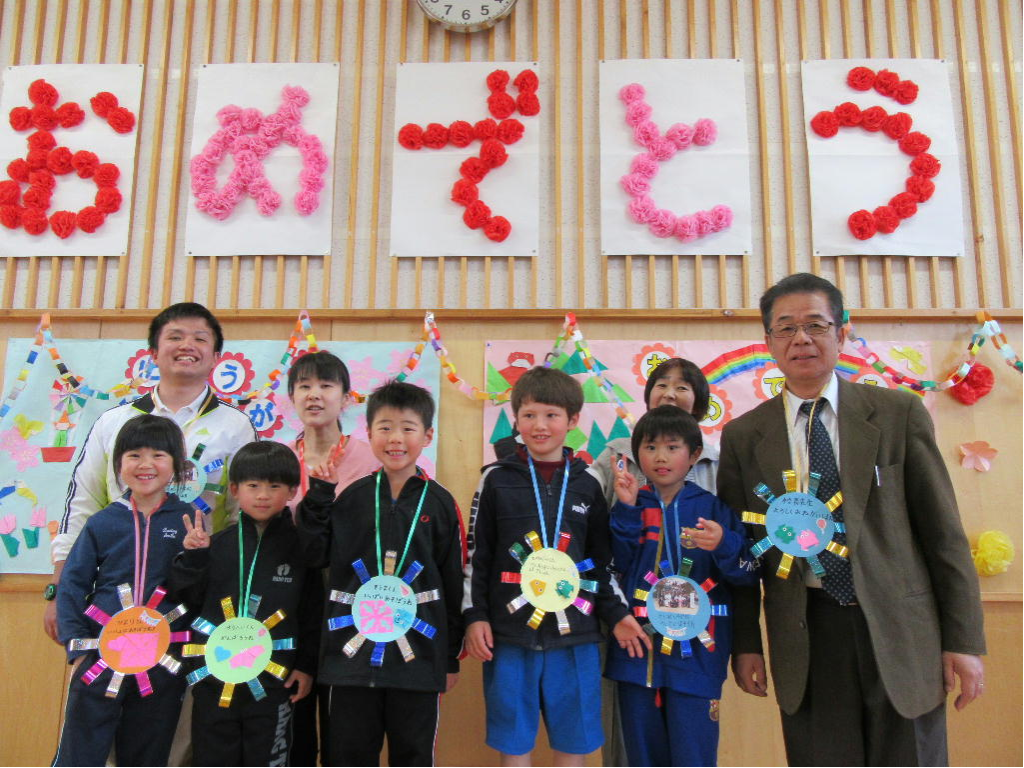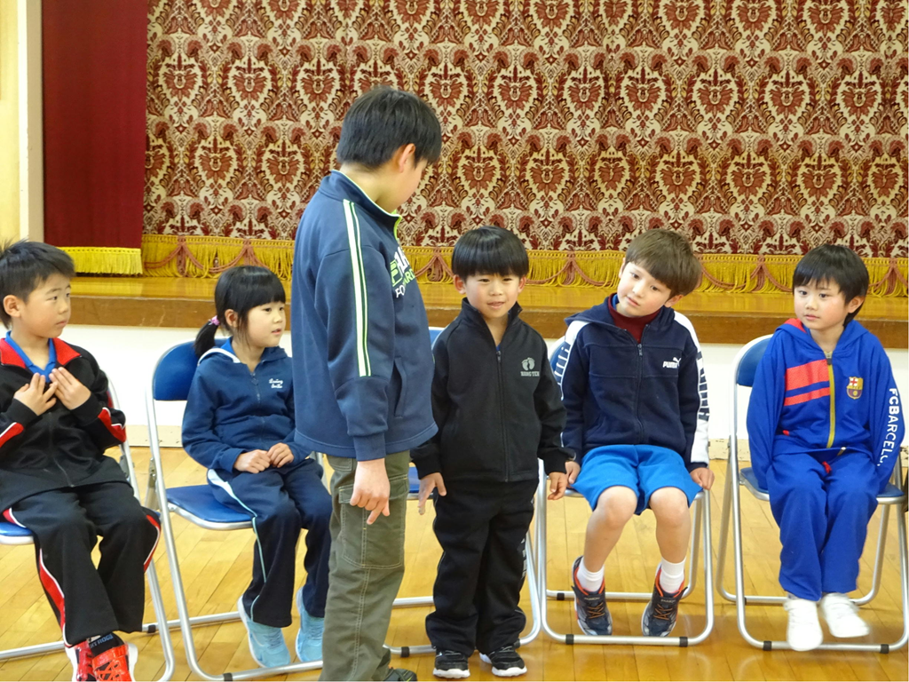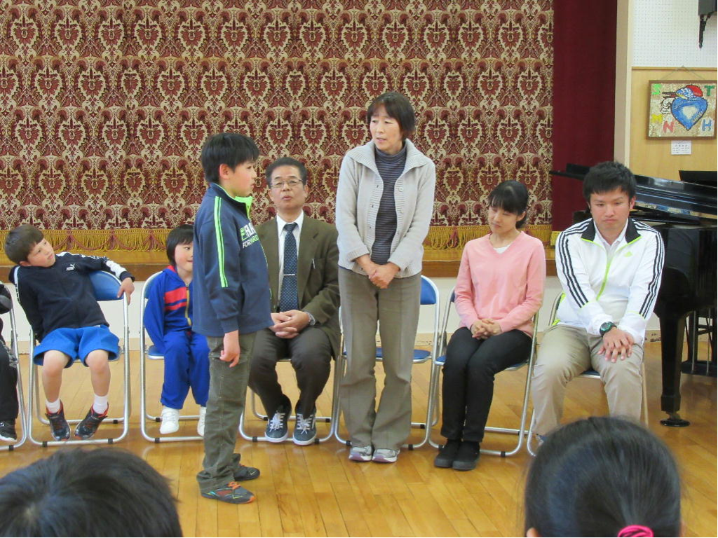 1年生と、新しく見えた先生方をお招きして、歓迎会を行いました。まずは、インタビュー。「小学校でがんばりたいことは何ですか?」「算数です」などと、一人一人に児童会役員のS君が質問をしました。インタビューでは、質問の答えに対してさらにコメントを言うのが、数年前からの慣例でしたが、今年もS君はがんばってコメントを言っていました。とても立派でした。その次は新聞紙ゲーム。なかよし班ごとに、新聞紙の上にみんな乗れるか勝負しました。抱っこしたり肩車したりと、それぞれ工夫しました。最後は、首飾りと歌のプレゼントで締めくくりました。とても楽しい35分間でした。