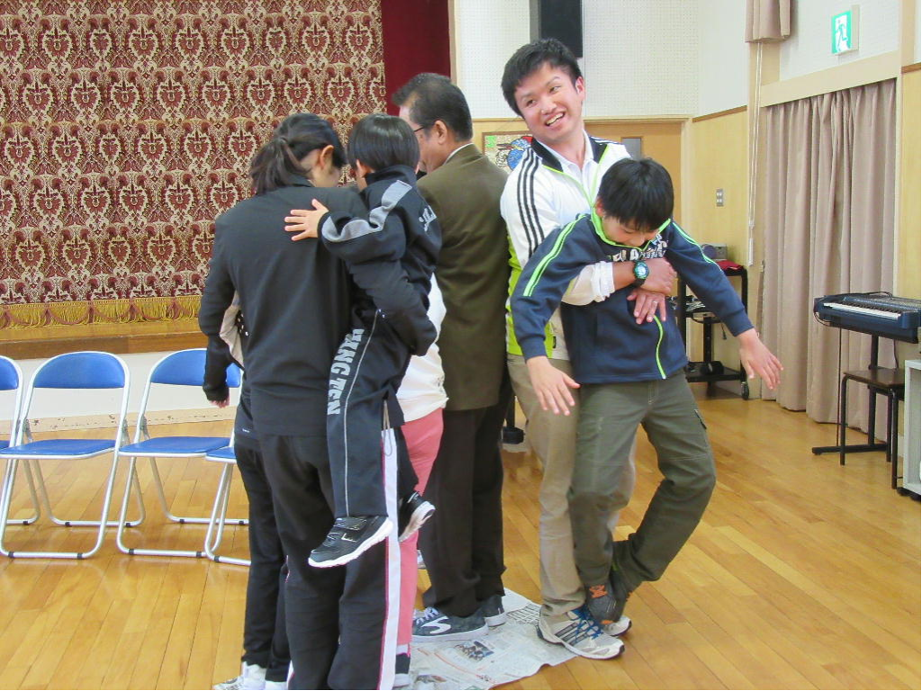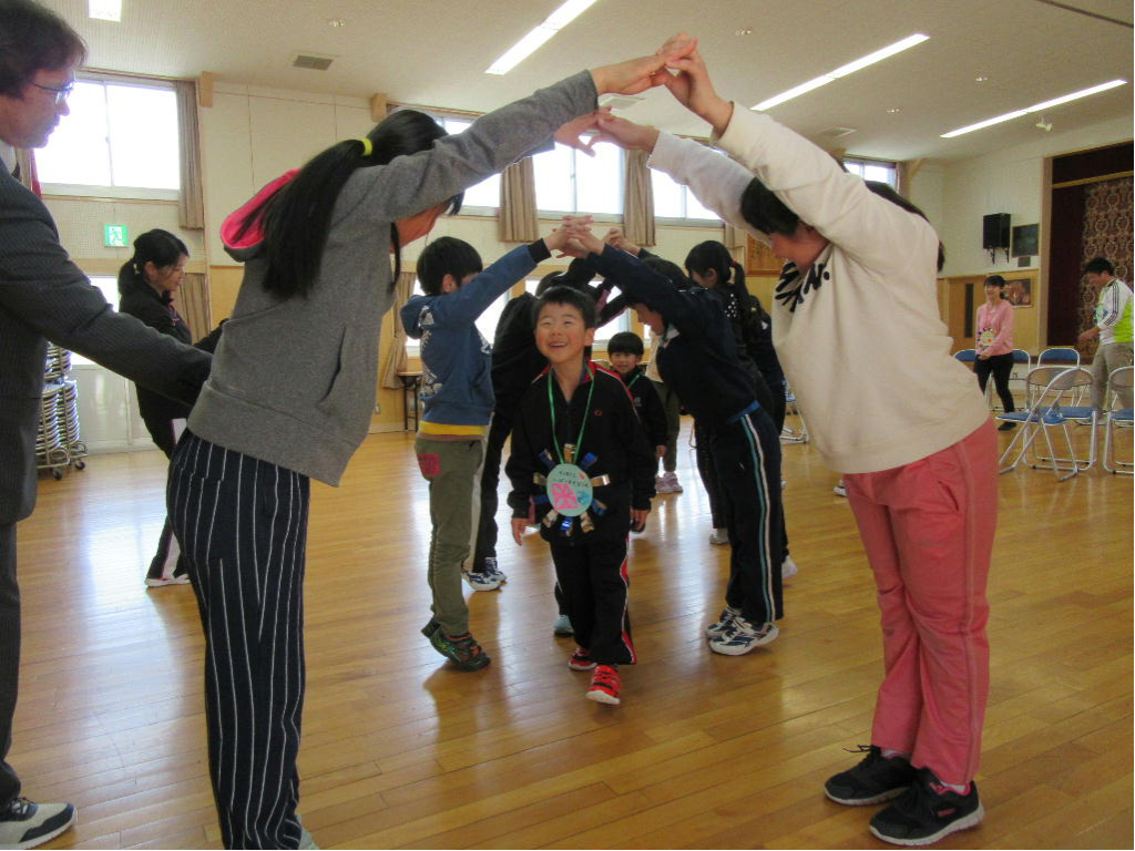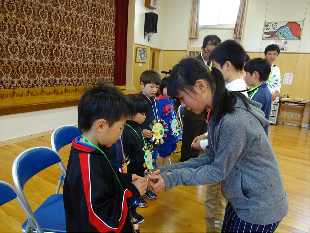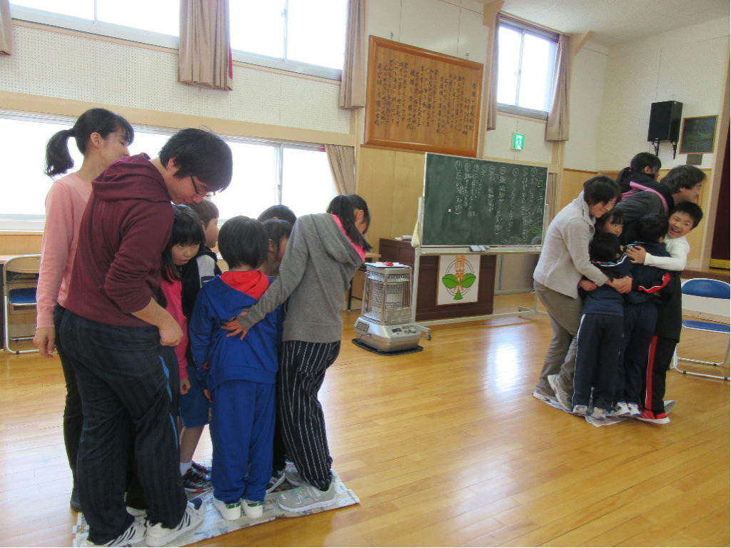 1年生と、新しく見えた先生方をお招きして、歓迎会を行いました。まずは、インタビュー。「小学校でがんばりたいことは何ですか?」「算数です」などと、一人一人に児童会役員のS君が質問をしました。インタビューでは、質問の答えに対してさらにコメントを言うのが、数年前からの慣例でしたが、今年もS君はがんばってコメントを言っていました。とても立派でした。その次は新聞紙ゲーム。なかよし班ごとに、新聞紙の上にみんな乗れるか勝負しました。抱っこしたり肩車したりと、それぞれ工夫しました。最後は、首飾りと歌のプレゼントで締めくくりました。とても楽しい35分間でした。