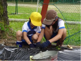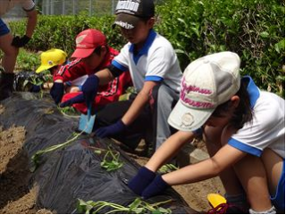 3つの縦割り班に分かれて、さつま芋のつるを植えました。昨年までは紅あずまのみでしたが、今年は紅あずまと紅はるかを植えました。たくさんできるようにと願いを込めて、ひとつひとつ丁寧に植えました。100本近い苗を、がんばって1時間で植えました。秋の収穫が楽しみです。