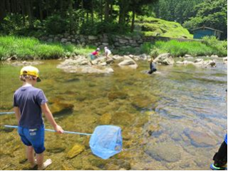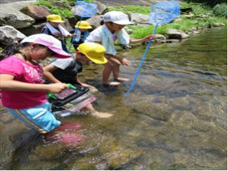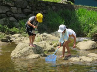 1・2年生が、生活科の勉強で、川の生き物探しに行きました。暑かったので、はだしで川に入るのはとても気持ちよかったようです。夢中になって生き物を探し、ヨシノボリやサワガニなどを見つけて喜んでいました。教室で飼うのか、逃がすのか、飼うとしたらどのようにして飼うのか、課題の追究が始まります。