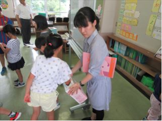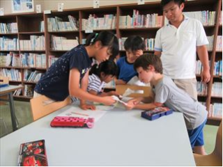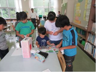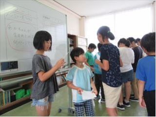 今回も、文化委員会が楽しい企画を考えてくれました。箱の中から問題を引き、その答えを、図書室にある本の中から探すゲームです。例えば、「『鳥海山の空の上から』という本に出てくる主人公は誰でしょう」というような問題が出されます。本を探し、その中を見て問題に答えるというゲームです。前回のゲームは本の題名を探すだけでしたが、今回はその中を見ないと分からないので、内容がレベルアップしました。縦割り班ごとに相談しながら、一生懸命問題に答えていました。