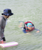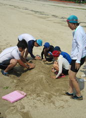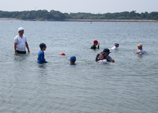 お昼の後は、水泳です。海に入ると、「体が浮くよ。」「気持ちがいい~。」とプールとは違う泳ぎの感覚を満喫していました。砂浜では、砂の堤防を作ったり、砂風呂をしたり、海辺を楽しみました。![]()