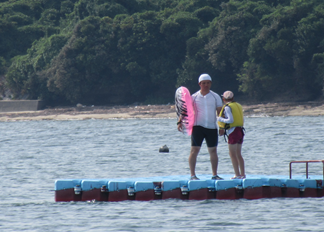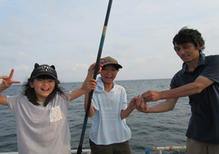水泳の後は、魚釣りです。魚増のご主人に釣り方を教えていただき、さっそく挑戦!!