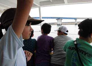 バスの中では、田峯小の友達と一緒に、歌やクイズなどをして楽しく過ごしました。「船は初めて」という子もいましたが、定期船にゆられ佐久島に入りました。