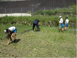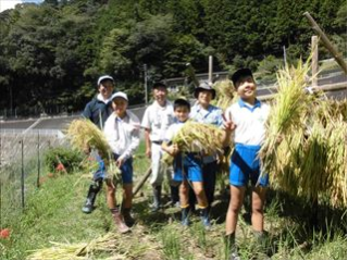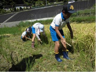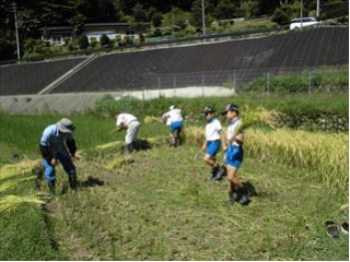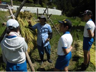 雨続きで、延期延期の繰り返しでしたが、ようやく稲刈りができました。田んぼに着くと、講師の方がもうすでに準備をして待っていてくださいました。稲の刈り方や置き方を教わって、さあ、稲刈り開始!暑い中でしたが、3人とも話をよく聞いて、一生懸命に稲刈りやはざかけ、そして落穂拾いをすることができました。稲の一本一本、米の一粒一粒を大切にすることを学びました。