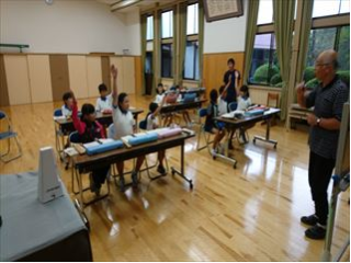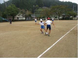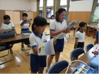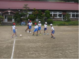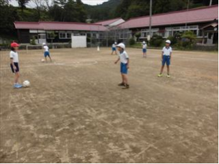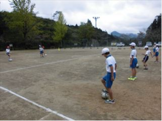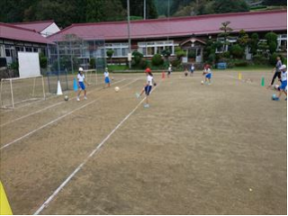 今回の内容は、 低学年 田峯小学校 「ボールけりゲーム」(体育) 「きらきらぼし」の合奏(音楽) 中学年 田峯小学校 「ラインサッカー」(体育) 「牧場の朝」「ゆかいな木琴」の合奏(音楽) 高学年 清嶺小学校 「ティーボール」(体育) 「和音」と「威風堂々」の合奏(音楽) でした。いつもと違う先生による授業や、いつもより賑やかな授業、お弁当に、子どもたちのテンションはずっと高めでした。普段使っていない遊具があるのも魅力のようです。シーソーは清嶺小にはないので、休み時間には、田峯小のシーソーをとても楽しそうに乗っていました。
