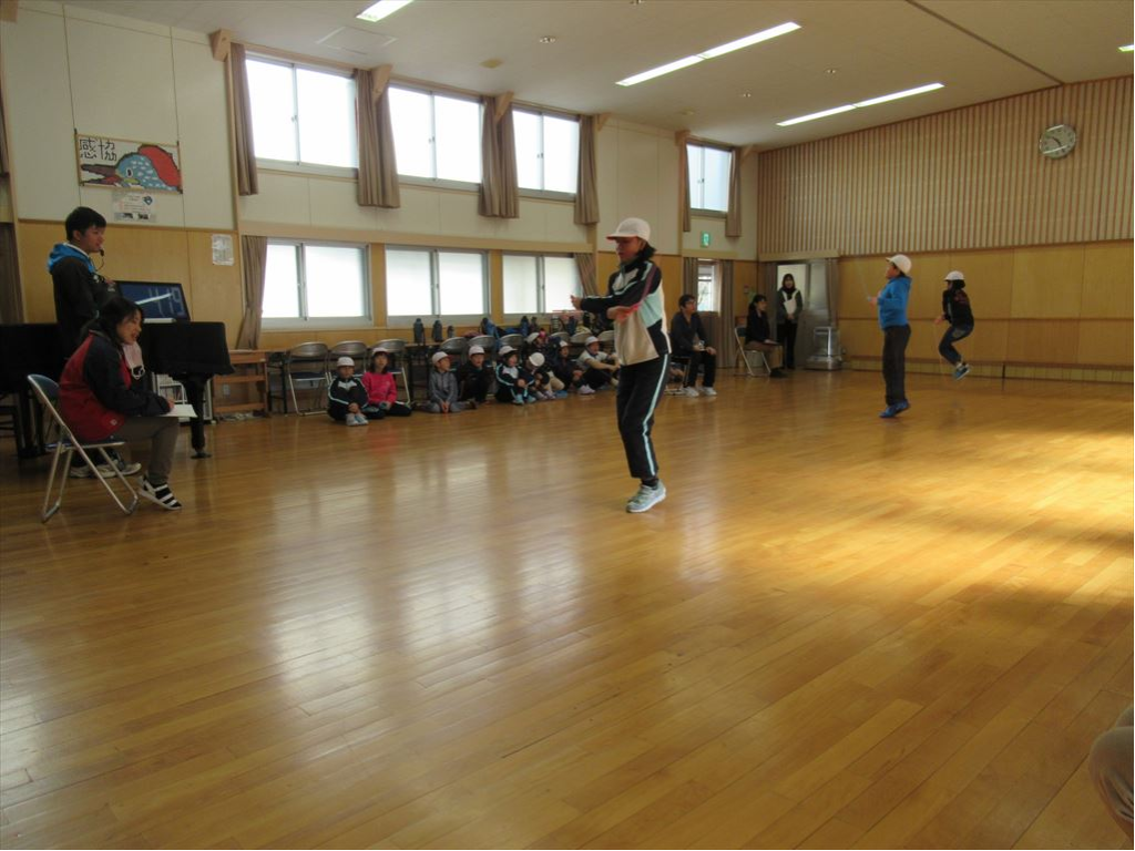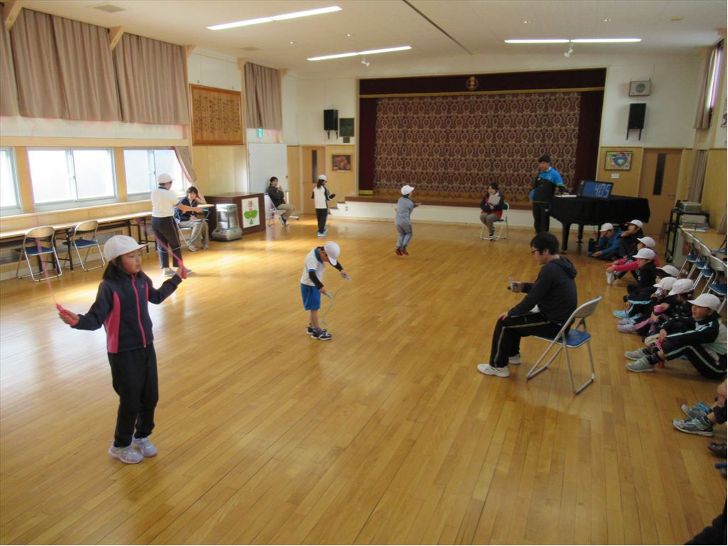 前跳び、後ろ跳び、あや跳び、交差跳び、二重跳びの中から、学年ごとに2~3種目、希望者はそれ以上の種目に挑戦しました。例えば、「1年生の前とびは100回」という具合に設定回数が決まっていて、それ以上跳ぶと認定証がもらえます。みんな、認定証がもらえるように、あるいは自己ベストが出るようにと、それぞれに目標を決めてがんばりました。一度に7人ずつ跳びます。自分が跳ばないときは休憩の時間ですが、みんなが跳んでいる子を応援していました。その声に背中を押されながら、顔を真っ赤にして跳んでいました。