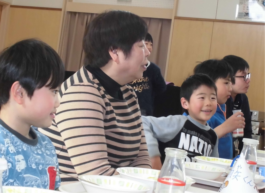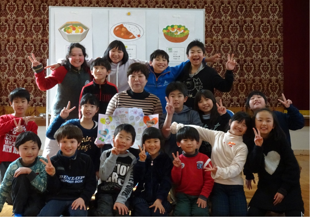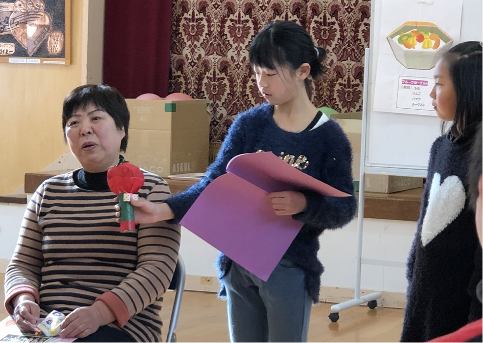 給食の献立は調理員さんのリクエストで一番得意な「カレーライス、フルーツヨーグルト、牛乳」です。 楽しい雰囲気のおかげでいつも以上においしくて、全員、残すことなくいただきました。ゲームは 「秋子さんクイズ」「ふれあいゲーム」、調理員さんのことを色々と知ることができました。全員で感謝のことばを寄せ書きしてプレゼントしました。 全校で 「ともだちになるために」 の替え歌を歌い、「ありがとう」 の気持ちを伝えることができました。調理員さんはとても喜んでうれし涙を流していました。