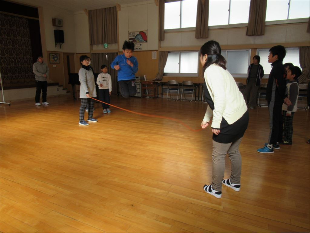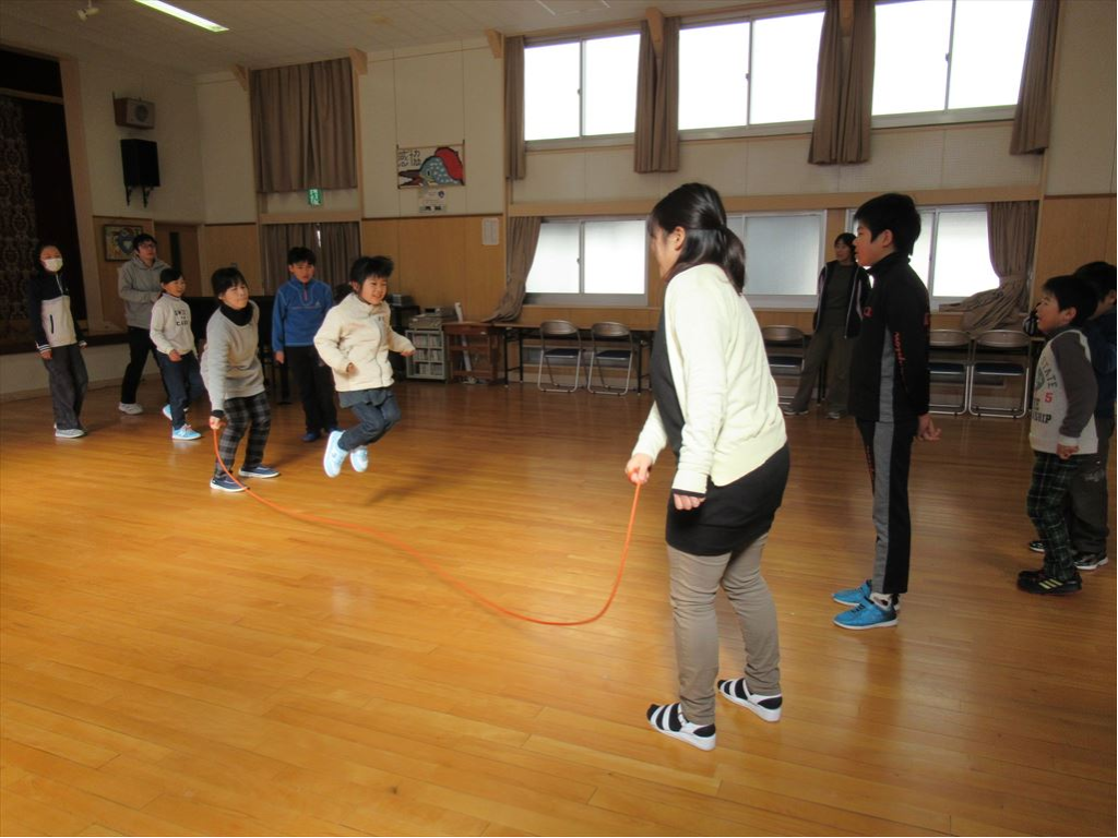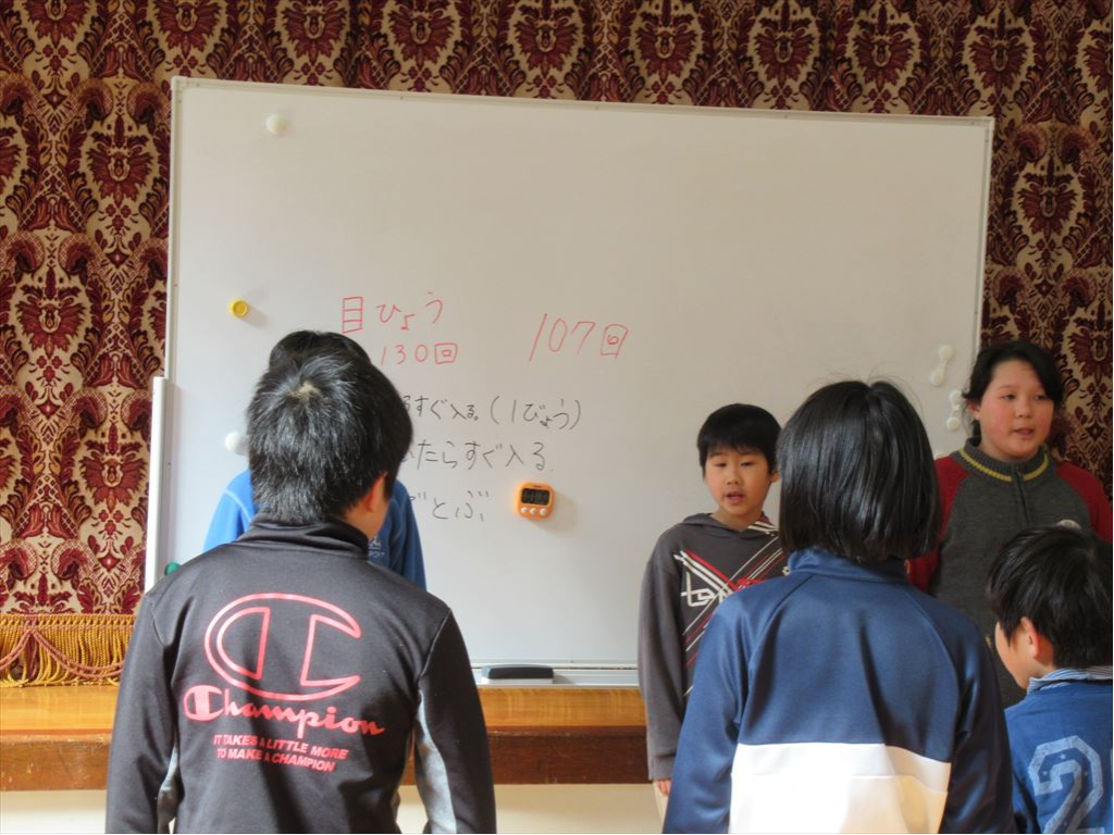本年度3回目の、そして最終のチャレンジ8の字とびを行いました。最初に、児童会役員が中心となって、どんなことに気をつければ記録が伸びるか話し合いました。今回も5分間練習し、5分間計測しました。記録は107回。本年度の最高記録でした。100回目を跳べたときには、みんなの数える声がひときわ大きくなりました。
