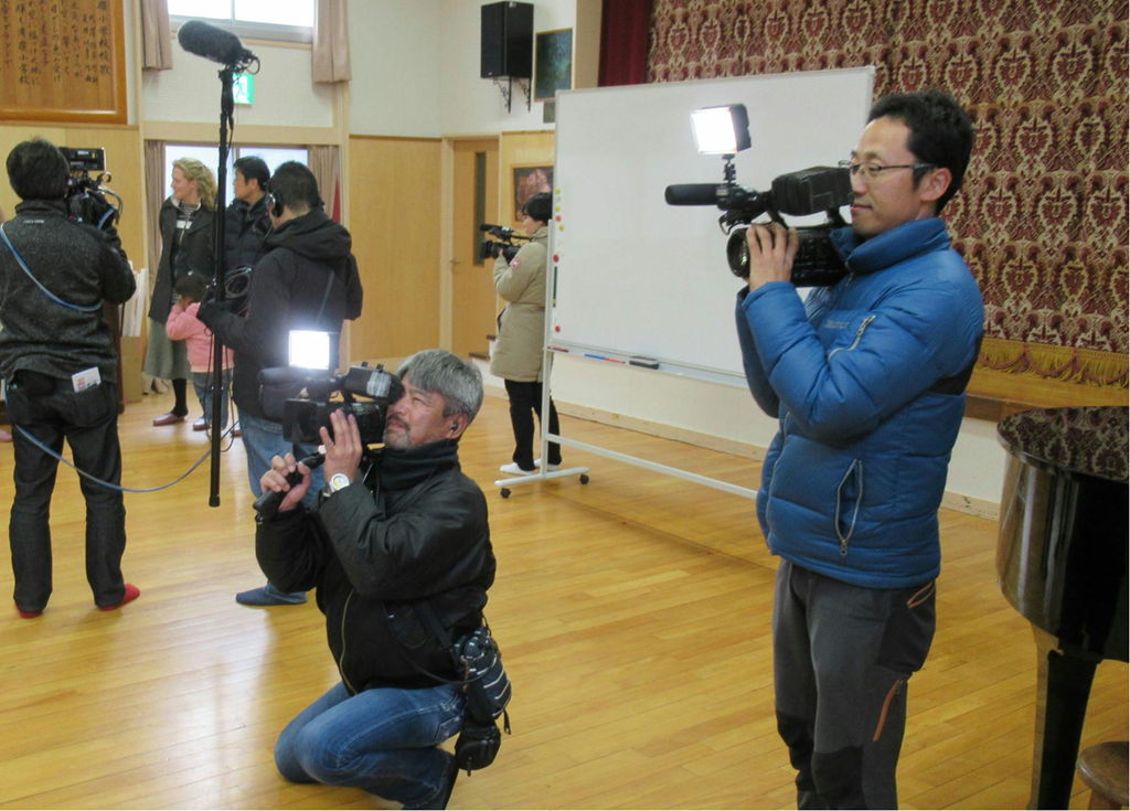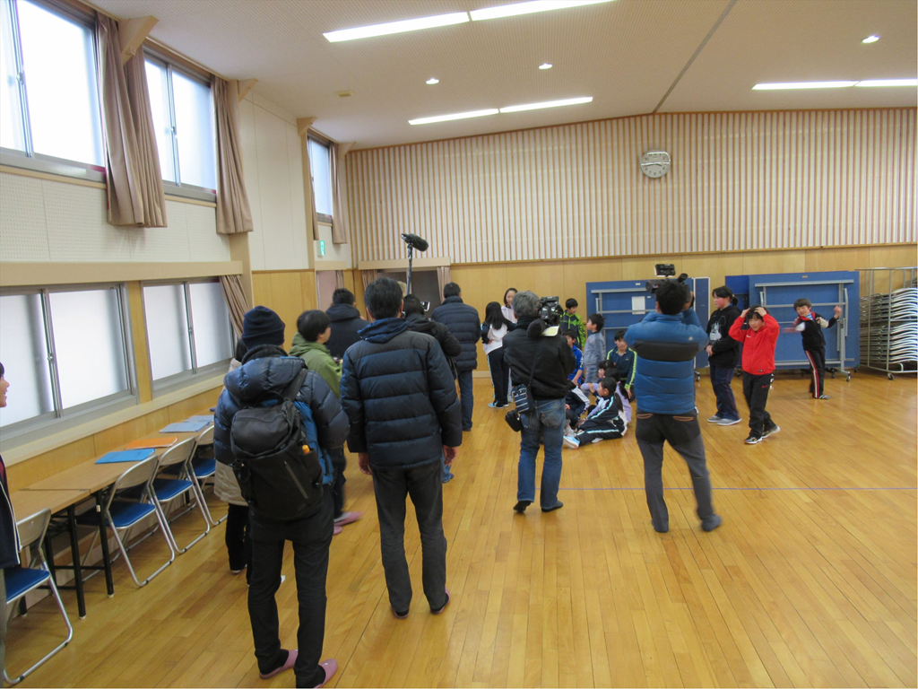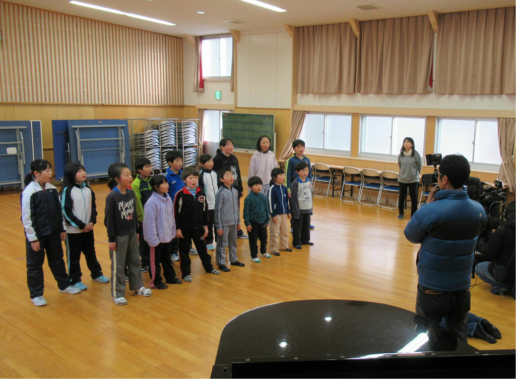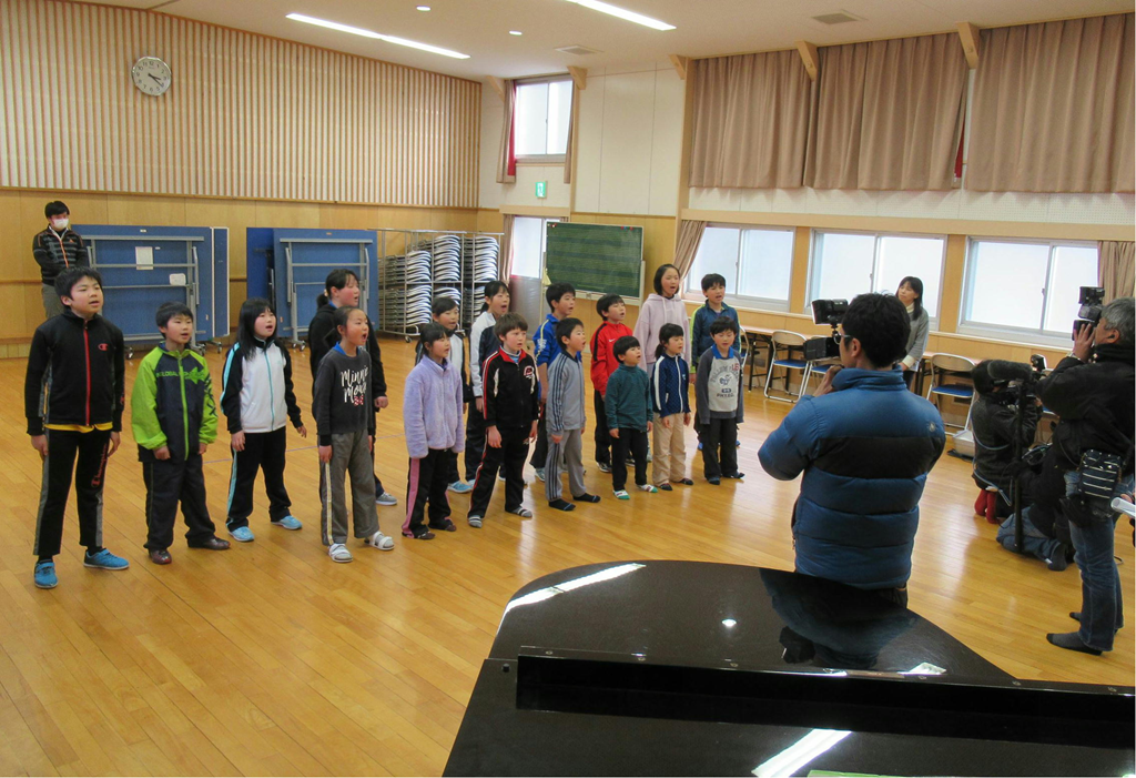 TV番組「ワタシが日本に住む理由」の撮影が、本校で行われました。俳優の高橋克典さんと、アナウンサーの繁田美貴さんが講堂に入ってくると、子どもたちの緊張も一気に高まりました。最初に『校歌』を聴いていただきました。緊張のせいか、普段はまちがえない所でまちがえたりしていました。次は『ふるさと』です。まだまだ緊張は続いていたようで、喉に力が入りすぎているように感じました。ところが、最近練習を始めたばかりの『絆』は、とても上手に歌えました。きれいな歌声を聞いていただくことができて、よかったです。お二人が写っている写真をブログに載せることはできませんので、3月11日のオンエアを楽しみにお待ちください。