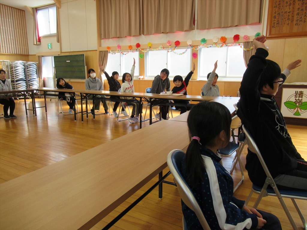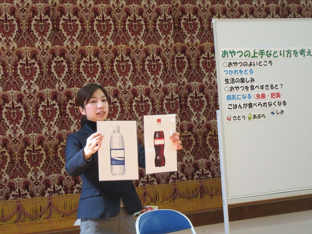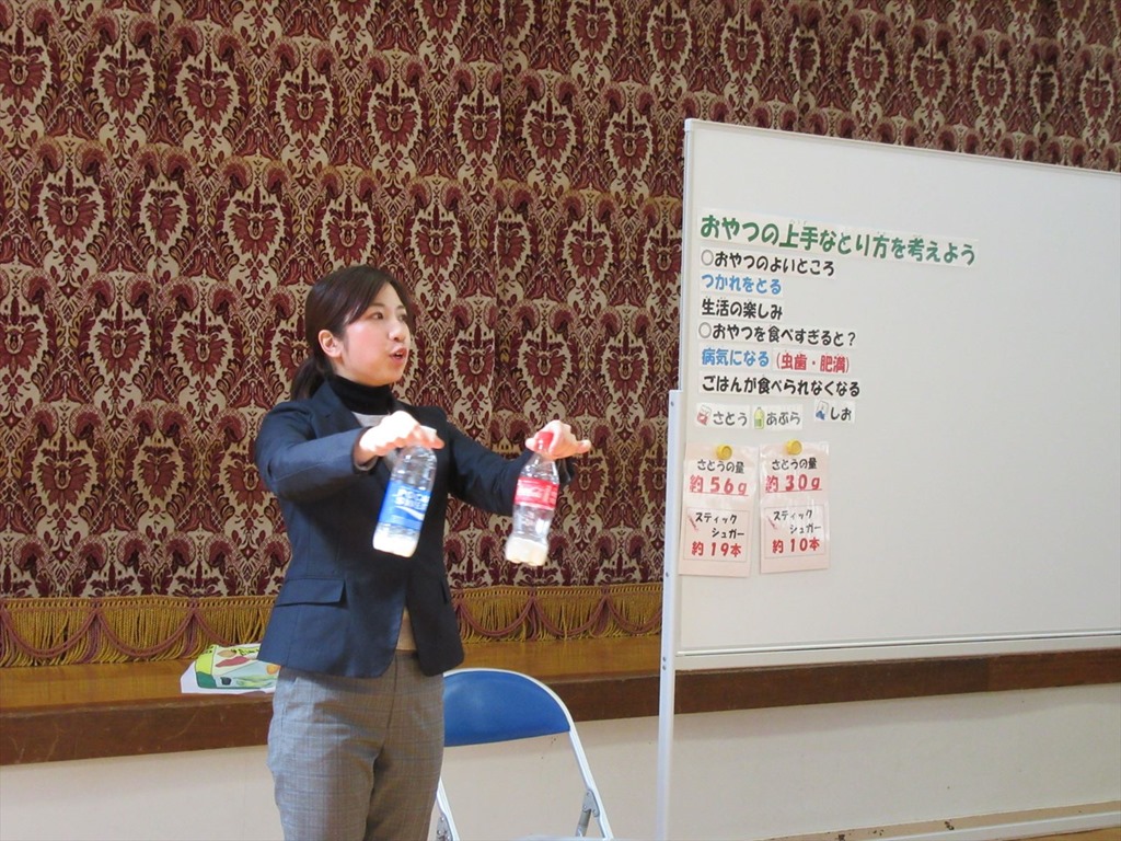 本年度3回目の栄養指導がありました。指導してくださったのは、名倉小学校の栄養教諭の先生です。今回は、「おやつのとりかた」について教えていただきました。おやつは、生活の楽しみでもあり、疲れを取ったり、気分をリフレッシュしたり、食事で足りない栄養素を補ったりするなど、役割があります。しかし、食べ過ぎると夕食や朝食が食べられなくなったり太ったりしてしまうので、カロリーの摂りすぎに気をつけること、カルシウムやミネラル、食物繊維などを多く含むものを積極的に摂ることなど、気をつけるべき点を教えてくださいました。