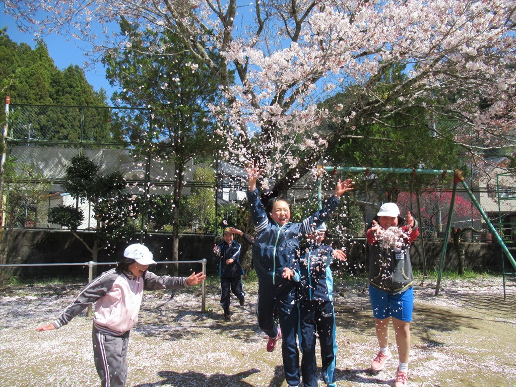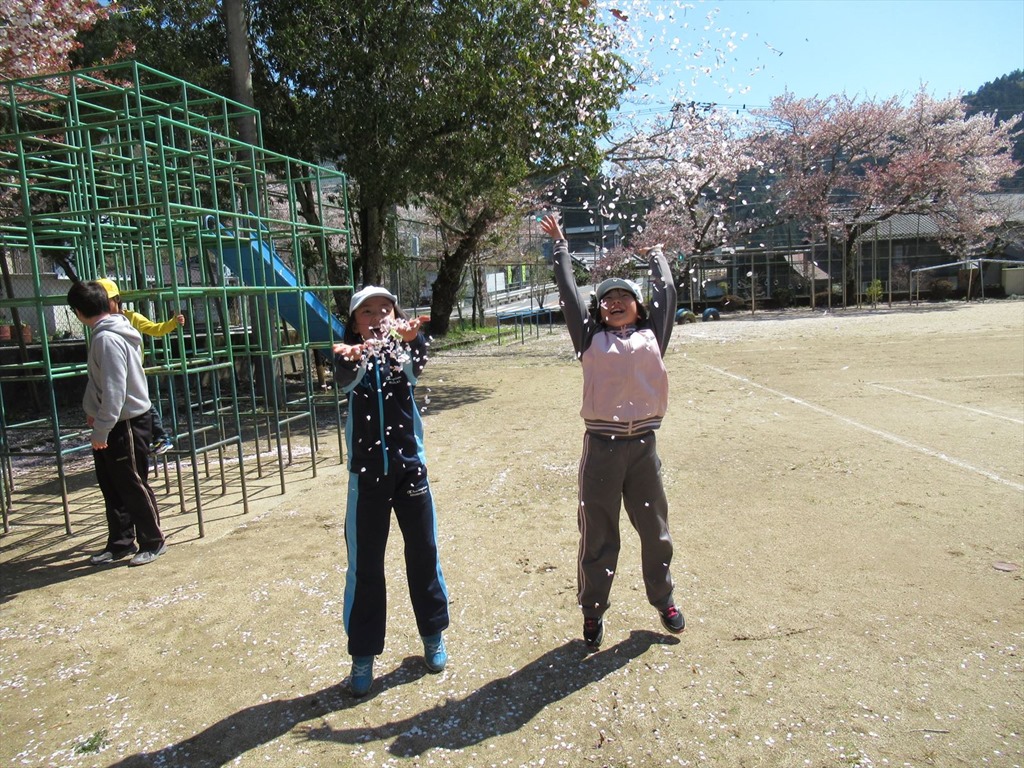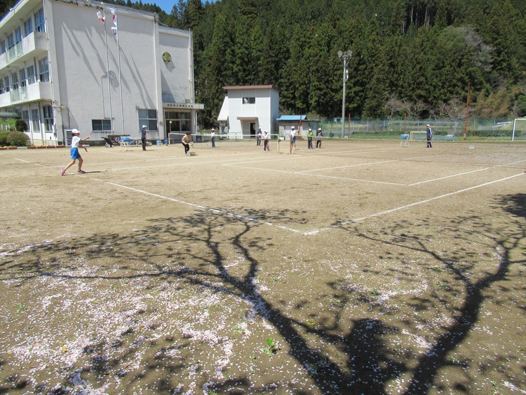 3~6年生は、1時間テニスの練習をしました。休み時間には、落ちた桜の花びらを集めて、桜吹雪を作って遊んでいました。