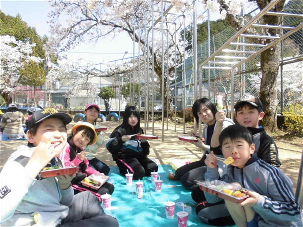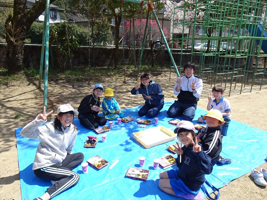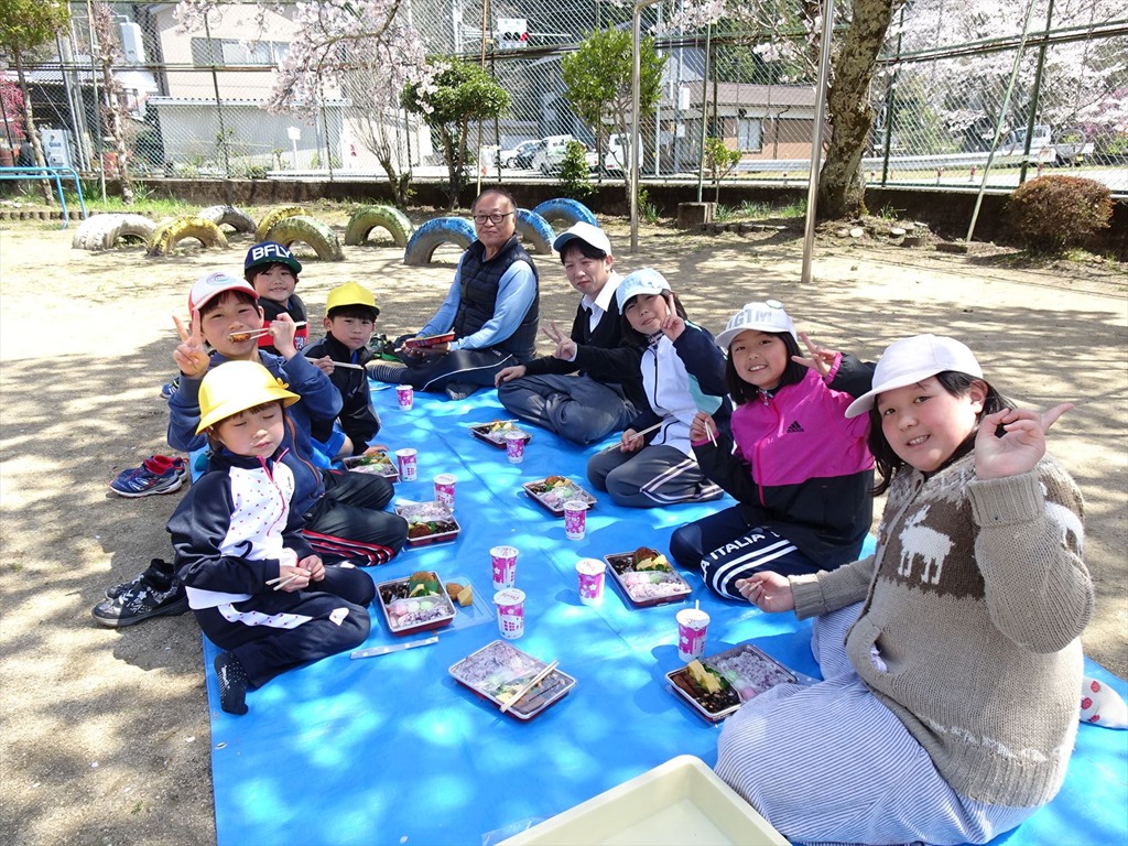 本年度最初の給食は、お花見給食。今年は、見事に満開の桜の木の下で食べることができました。去年は桜の花がすっかり散った後で、しかも、寒かったのですが、今年は日陰を選んで座るほど暖かくて気持ちよかったです。子どもたちは、みんな「おいしい」と言って喜んで食べ、全員時間までに完食しました。30人分のおいしいお弁当を、一人分ずつ詰めてくださった調理員さんに感謝です。お天道様にも感謝です。食べ終わった後は、縦割り班ごとに写真を撮りました。今年1年間、この班でいろいろな活動に取り組んでいきます。