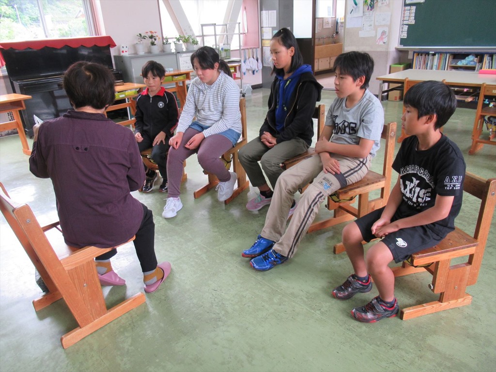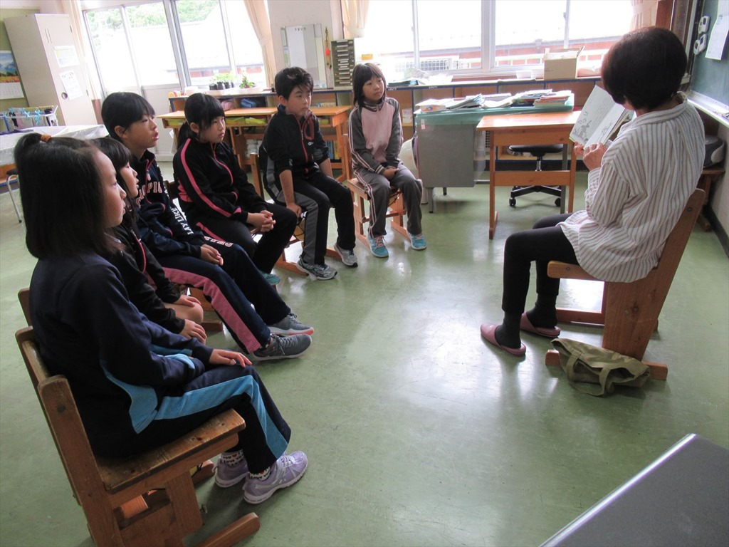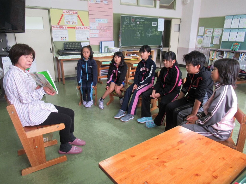 低学年は、『はなちゃんのみそ汁』を、中学年は『しまうまのたんけん』を、高学年は『紙しばい屋さん』を読んでくださいました。