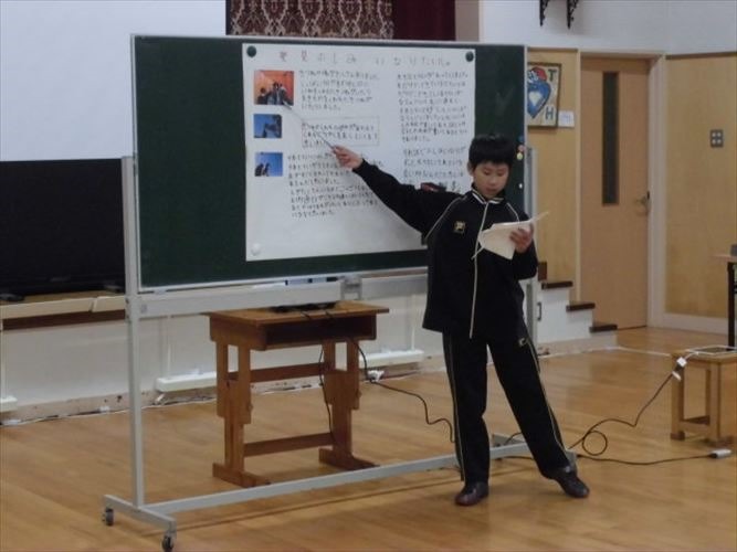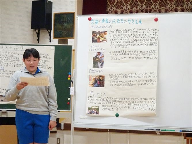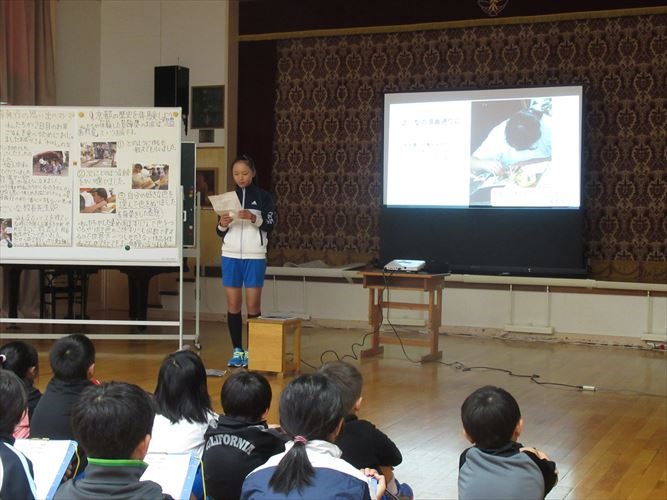 本校では、学んだことを学級ごとに発表する会を「あすなろ交流会」と名付けて実施しています。今回は、高学年が、修学旅行で学んだことを発表しました。今年の高学年は、「見てきたもの」だけでなく、「出会った人々」について感じたことも発表していました。心も温かくなる発表でした。