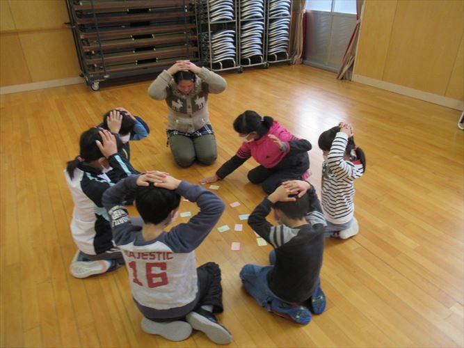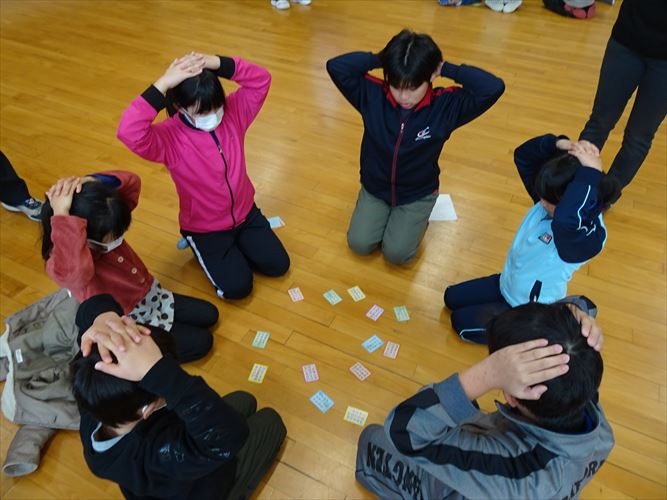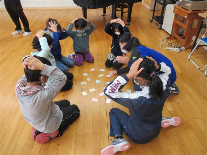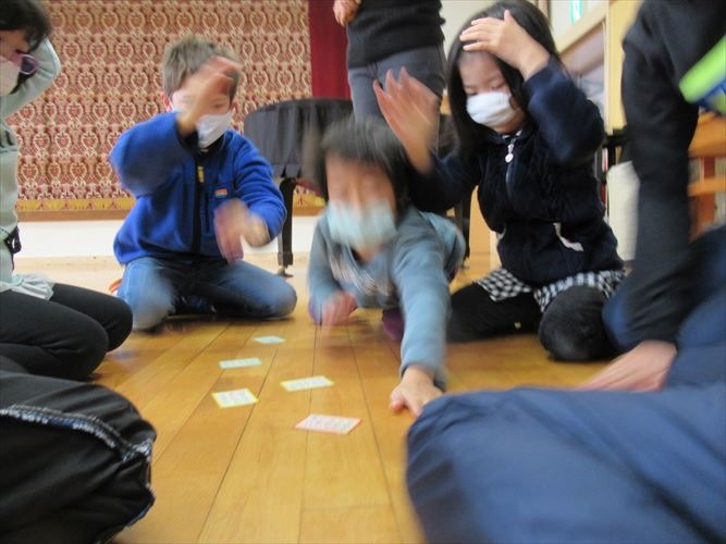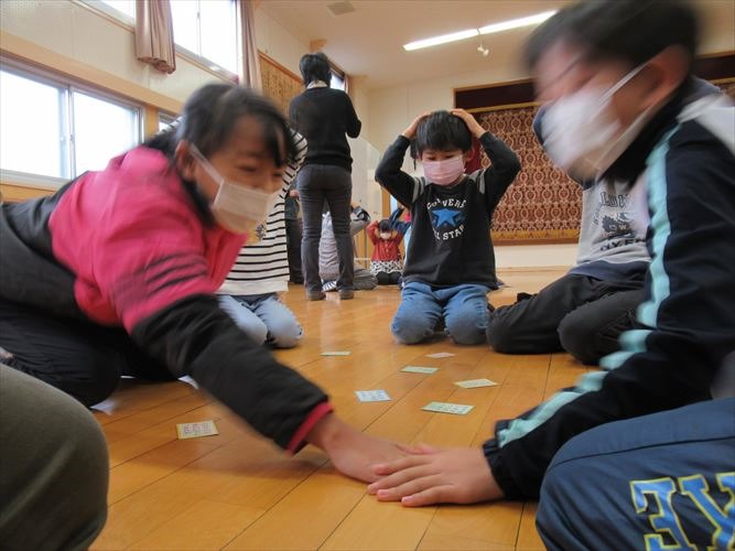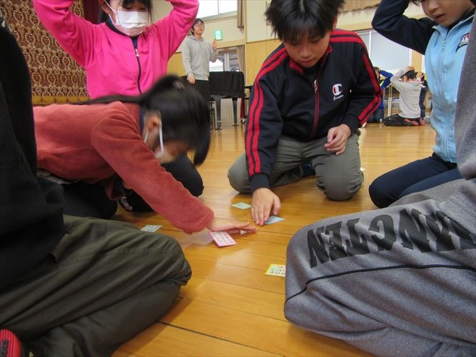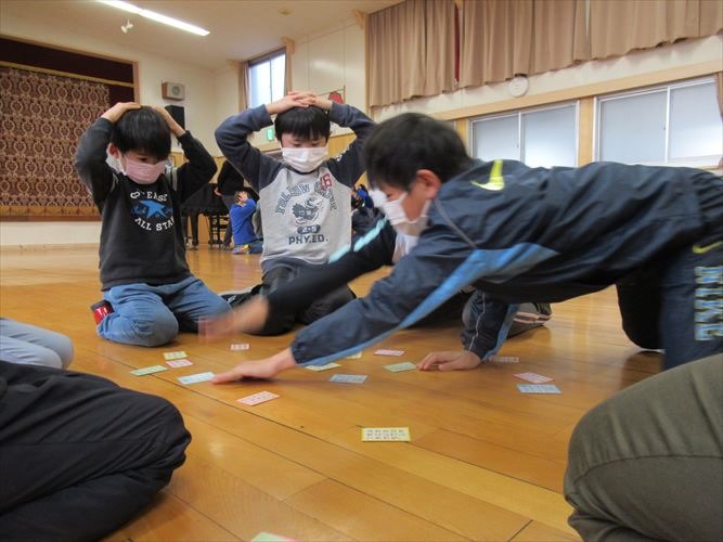 全校で、なかよし班ごとに分かれて百人一首プレ大会を行いました。ルールを確認しながら、20首を取り合いました。事前に練習した成果を発揮して、低学年の子達も見事に札を取っていました。