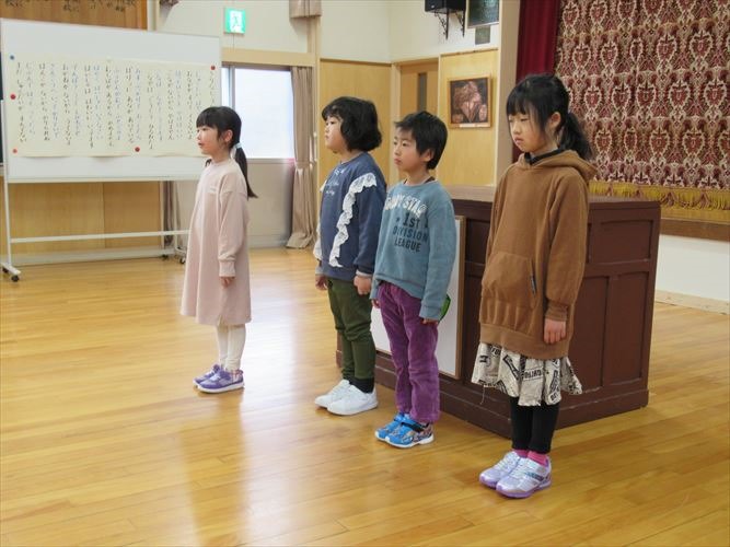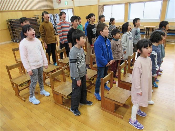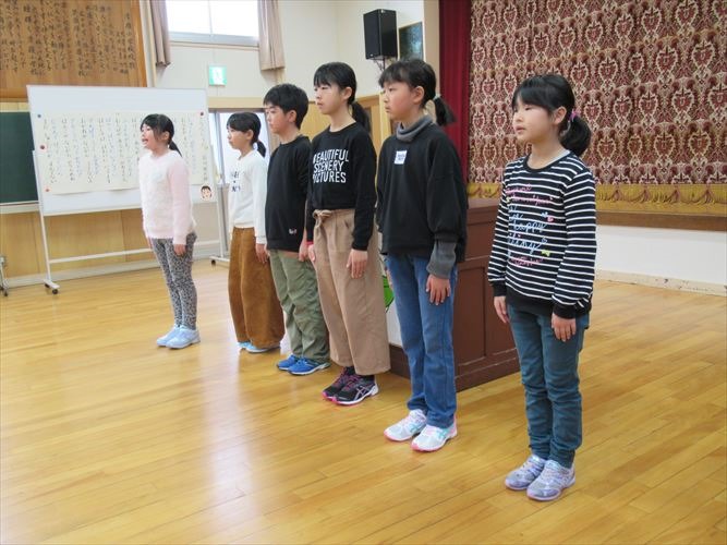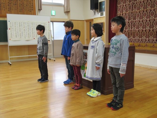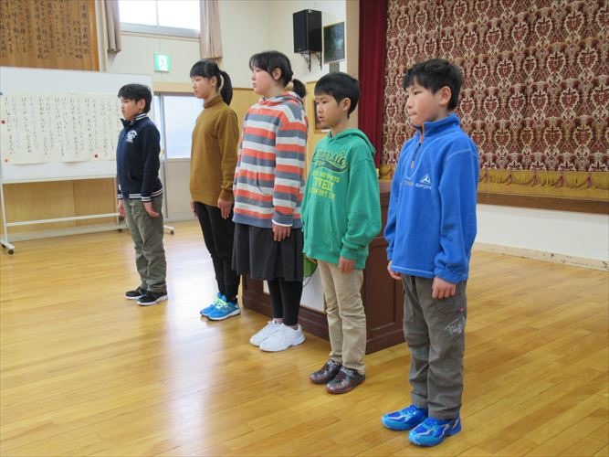 「私が冬休みにがんばったことは、豆腐作りを手伝ったことです。」「私は田んぼの道作りを手伝いました。」「僕は九九の練習をたくさんしました。」「僕は縄跳びの練習をがんばりました。」「私は家族と山登りに行きました。」などなど、それぞれ充実した冬休みだったことが伝わるスピーチでした。全員そろって、元気よく3学期がスタートできて良かったです。