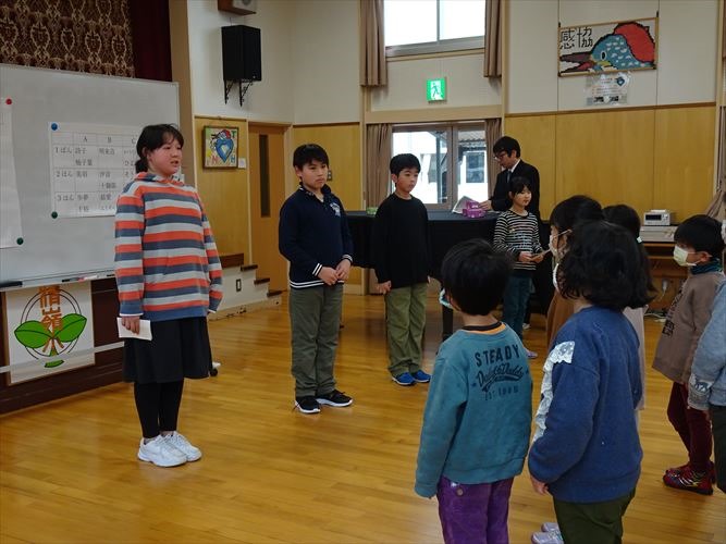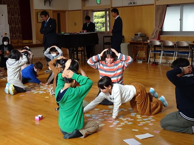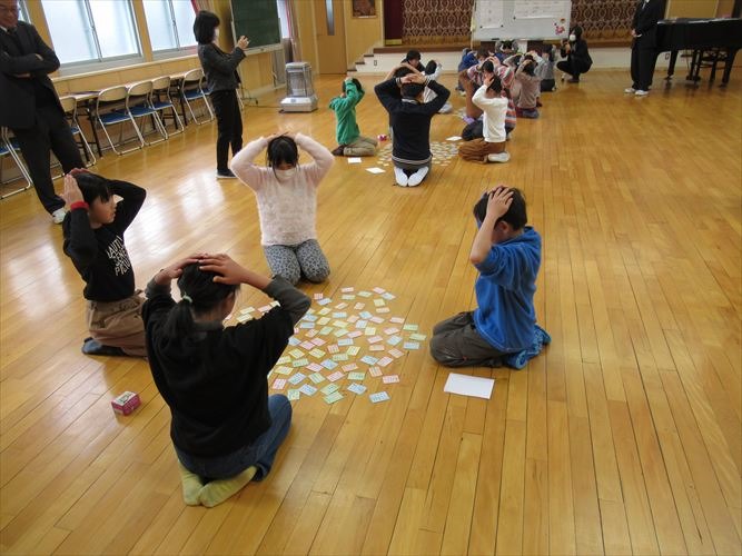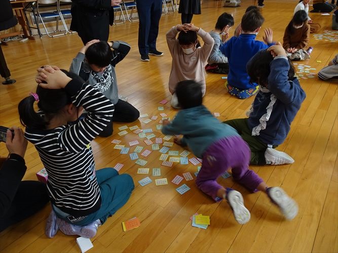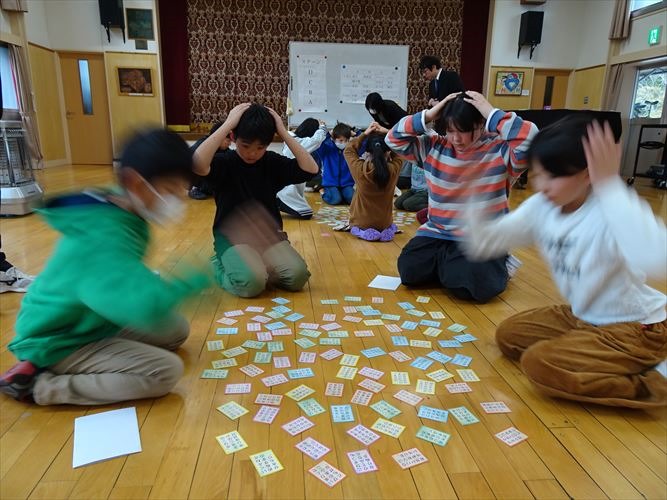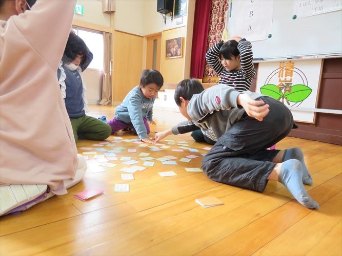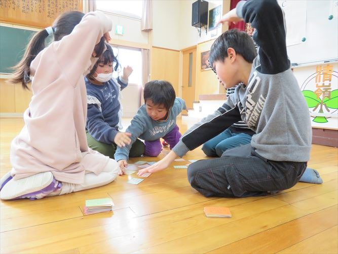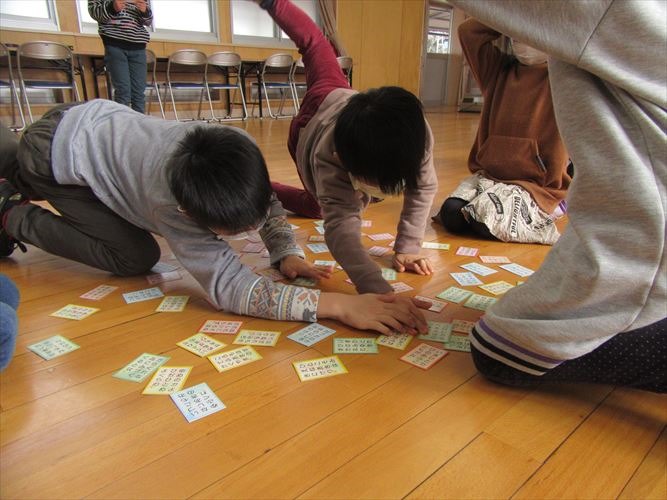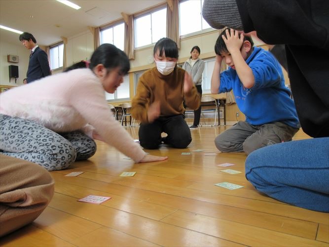 5人ずつ、4つのグループに分かれて行いました。冬休みの間に練習したことがよく分かる、白熱した競技になりました。低学年の子でも、自分が知っている歌が詠まれると、上の句が詠まれているうちに取っていました。