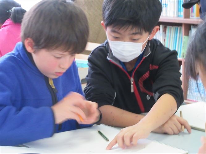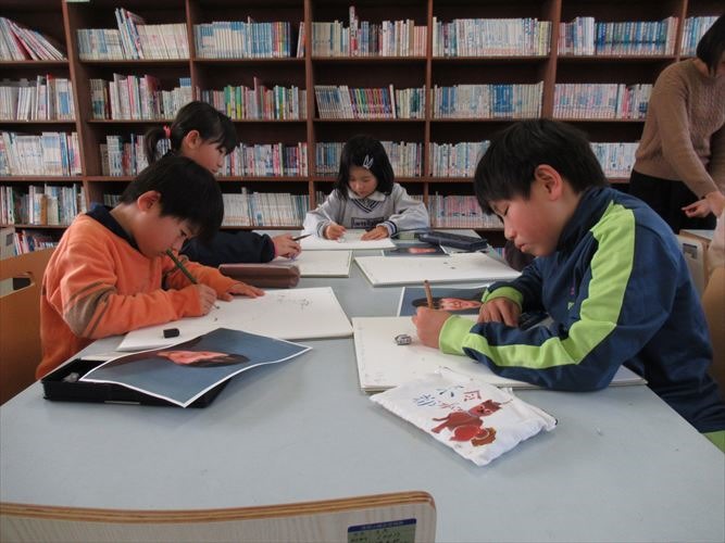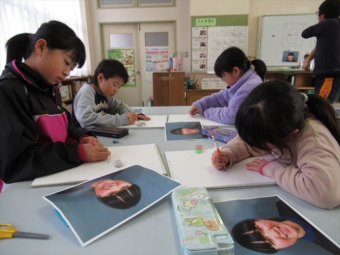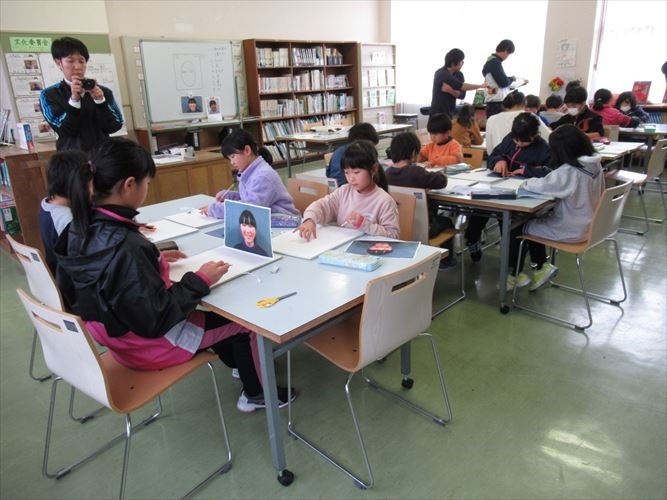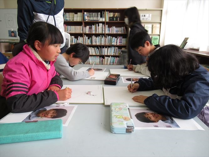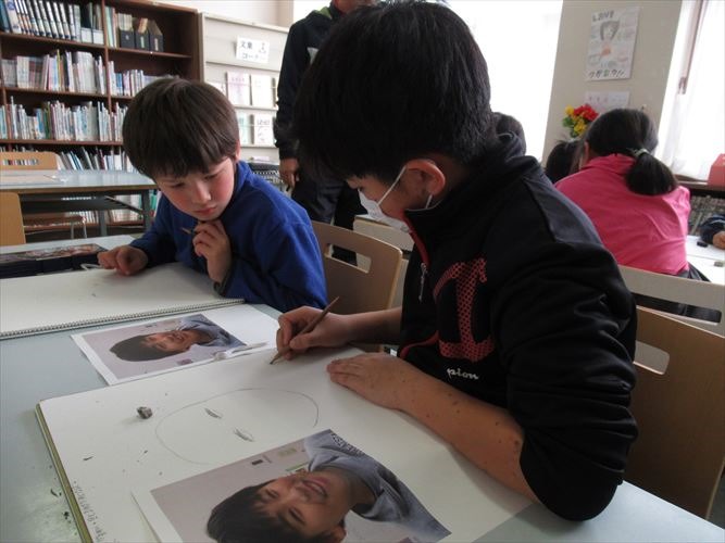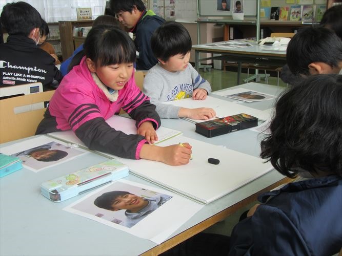 本校では毎年、卒業生に似顔絵をプレゼントしています。今日は、1年生から5年生が一緒に卒業生の似顔絵を描きました。完成は来週の予定です。