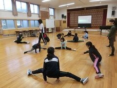 朝の活動は、体つくりです。体つくりでは、今週のストレッチである「横またわり」と「横またわりからの前くつ」もしていました。