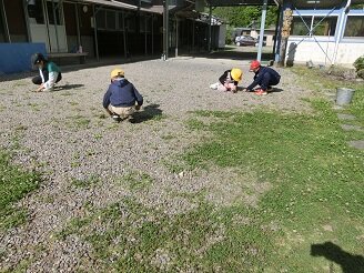 縦割り班ごとに分かれて、もくもくと草取りをしていました。掃除のときも、もくもくとしています。