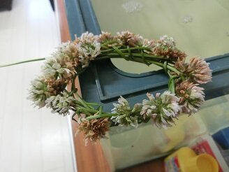 1年生の子が、シロツメクサで作った飾りをプレゼントしてくれました。シロツメクサの花言葉に「幸運」があります。四つ葉を見つけると幸せになれるという言い伝えからだそうです。