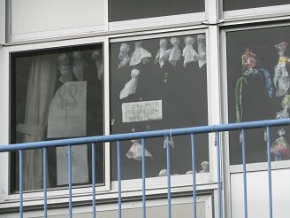 1・2年教室の窓には、たくさんの「てるてる坊主」が晴れることを祈っています。