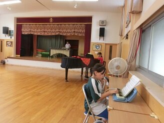 講堂から、合奏の音色が聞こえてきました。見に行くと、4、5、6年生の女子が、自主的に練習をしていました。繰り返し繰り返し練習していました。2時間目のあとの休み時間にも練習をしていたそうです。