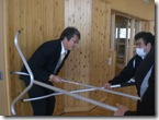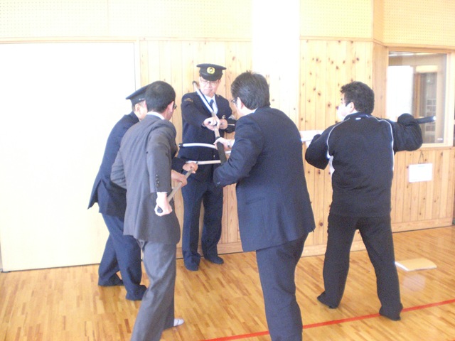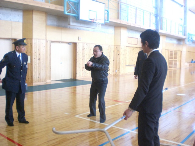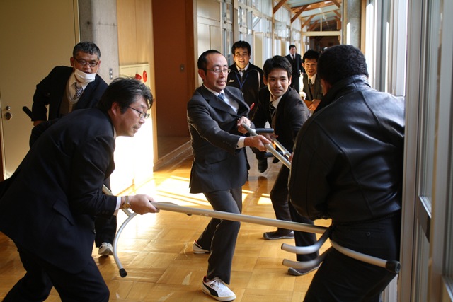 まず、先生たちにさす又やいすを使って不審者に立ち向かう訓練を行いました。