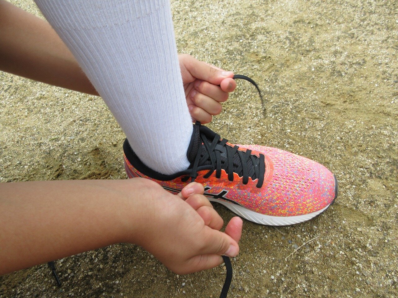 最初に夏目流の靴ひもの結び方を教えていただきました。生徒からは、「これなら速く走れそう」や「靴ひもが解ける心配も無さそう」などの声が聞こえ、新しい知識に興味津々でした。早速、次の日の駅伝練習で取り入れている生徒も多く見られました。他にもフォアフット走法などの走り方の基礎を実技を通して学ぶことができました。講習会後には、さらに速く走りたいという生徒が夏目先生の所へ行き、練習方法や走り方についてたくさんの質問をしている姿も見ることができました。