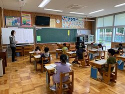 今回は、お礼の言葉と学年メッセージカード渡し、一人一人のご挨拶という短い時間での交わりとなりました。しかし、他校勤務の栄養教諭さんや、別棟の調理場勤務の調理員さんと、久々に顔を合わせる機会であり、1・2年生にとっては初めての出会いの場となり、心温まる交流ができました。「いただきます」の意味を知っておいしく食べてほしいという願いや、「みんなの歌が時々聴こえるよ」 というお言葉があり、子どもたちも集中してお話をうかがうことができました。
