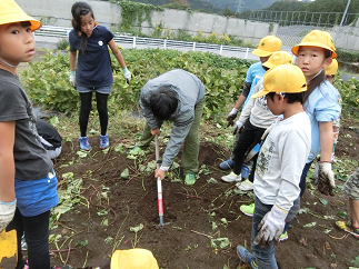◆この日は、4年生がサツマイモの収穫を行いました。長いツルをたどりながら、丸々と太ったサツマイモを掘り出していきました。サツマイモを見つけるたびに、大きな歓声が上がりました。