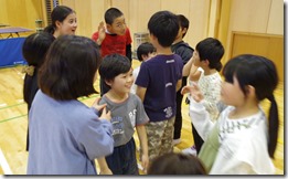 まずは、「あいこじゃんけん」で心をほぐし、ムードを高めます。3回あいこになった人から座るというゲームですが、大いに盛り上がりました。いつもは勝ちたいと思うじゃんけんですが、あいこにならないと座れません。先生が何を出すのか…雰囲気を読んで…低学年も夢中でした。