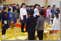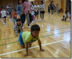 最後は、「若返りじゃんけん」で退場です。3回じゃんけんして、負ける度におじいさん・おばあさん、お父さん・お母さん、子ども、赤ちゃんと若返ります。おじいさんのままの子から、赤ちゃんまでいろいろいますね。時間の関係で全部はできませんでしたが、楽しいひと時を過ごすことができました。高学年の力を感じた時間でもありました。