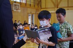 なかよし学級の1年生と6年生の顔合わせです。自己紹介をした後、さっそく外で一緒に遊びました。折り紙はプレゼントでしょうか。これから1年間、お世話になります。