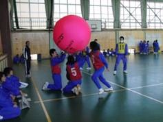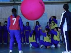 5・6時間目に全校でスポーツレクリエーションを行いました。キンボールという種目で,生徒の中には初めてやるという子もいました。初めてのキンボールは紙に書かれたルールを見ただけでは、どのようなものなのか想像することが難しく、反則についてもどういう状況で起きるのかよくわかりませんでした。しかし、実際にやっているところを見ると、とてもわかりやすいものでした。敵の班が投げるボールをキャッチするのですが、そのボールは大玉ころがしのボールのように大きく、一人では支えきれません。そのため、班のみんなで協力してキャッチします。どこに飛ばされるかわからないため、班員はばらばらに待機していて、飛ばされたボールが落ちる前に全力で取りに行きます。スライディングをして何とかあげようと試みる姿もよく見られました。私も人数の足りなくなってしまった班に入って参加しましたが、走って投げての連続でとても体力がいるスポーツでした。遠くに飛ばしたいという気持ちから、勢いよく腕を振ってボールを飛ばすため、腕を痛めそうになりました。