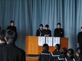 代表の生徒たちは、全校生徒の前で元気よく話しました。寒い体育館でしたが、全校生徒が、3学期への熱き想いを共に確かめ合う式となりました。