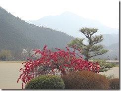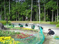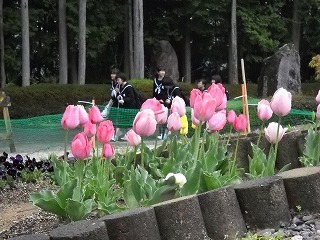 昨日の入学式でも何人かの方が祝辞の中で、この雄歩道について、触れてくださっていました。今日は残念ながら霧で明神山はみえなかったですが、春の雨に濡れた満開のチュ-リップが出迎えてくれました。
