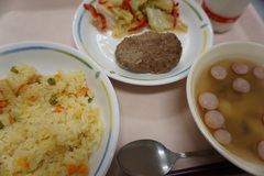今日の給食の献立は、ごはん、牛乳、ヤンニョムチキン、野菜とツナのごま和え、たまご豆腐汁でした。