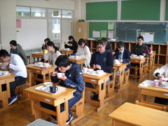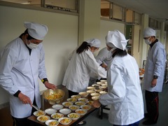 休業中、教員は弁当持参です。いつもの給食のありがたさが身にしみます。そんななか、栄養教諭と調理員さんたちが協力して、給食の新献立の考案に挑戦する企画を立てました。その試食をかねて、先生方が新学期に備えて「給食シミュレーション」をしました。給食委員(麻梨子先生)も給食当番(寛幸先生・悠里先生・湯浅先生)も生徒も、それぞれ役割を担いながら、実際の給食場面を想定しての取組でした。ハプニングはいろいろありました。最初だったので、時間もわりとかかりました。あと2回予定されています、きっと今日よりはスムースに進むはずです。(ちなみに、食べる人たちは、もちろん実費負担です)