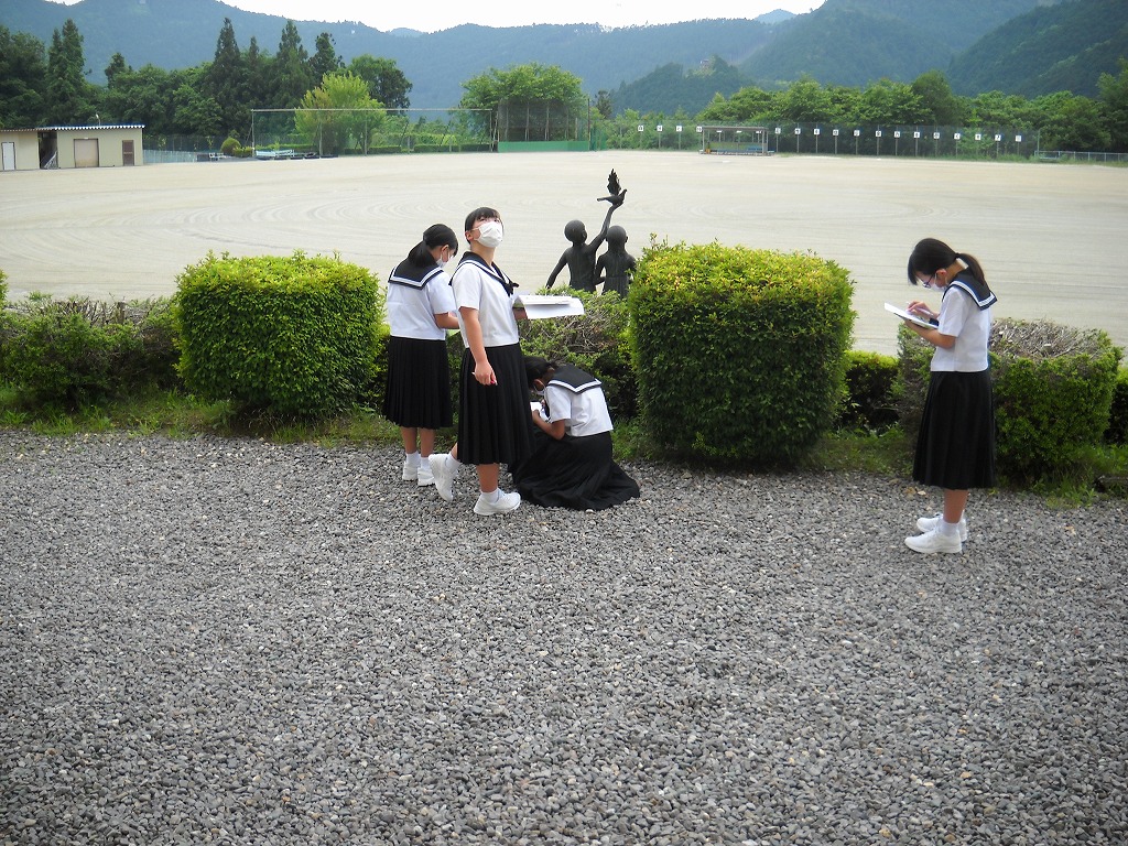 木の葉の新緑がまぶしいです。ホトトギスの鳴き声が聞こえます。ウグイスの谷渡りも響いています。初夏を目でも、耳でも、心でも感じることができます。分散登校4日目、少し季節を感じる余裕が出てきました。1年生の生徒が校長室前に植物観察にやってきました。