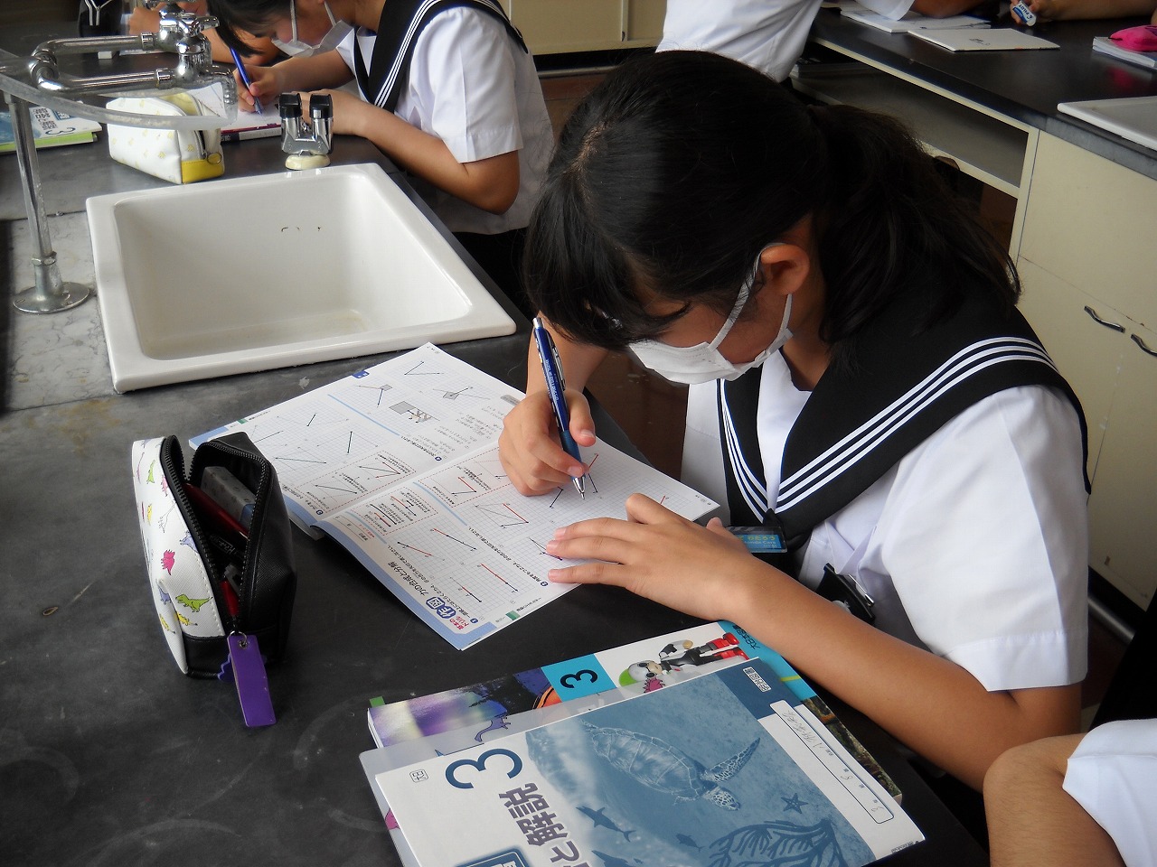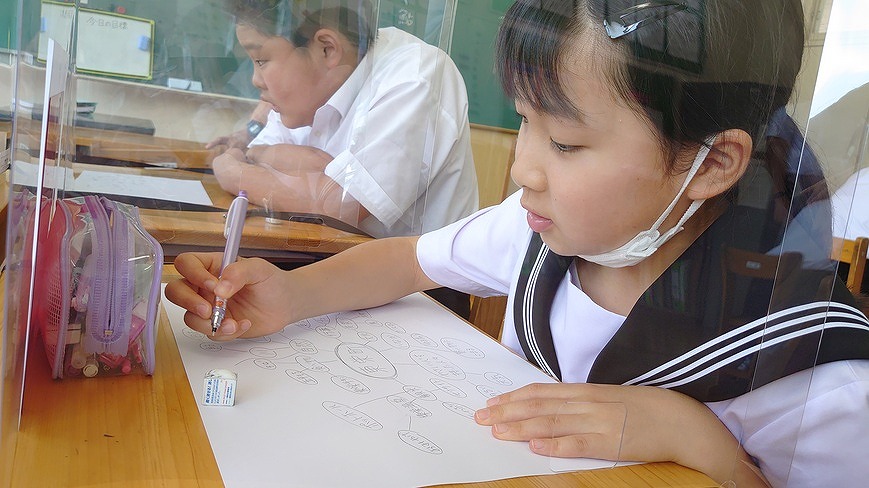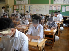 コロナウイルス対策と熱中症予防対策、学習活動効率化(話し合い活動・英語学習)のために、教室の机に透明のパーティーションを用意して、今日から使い始めました。理科室では、学校訪問で密の心配のご指導を受け、対面にパーティーションをおいて授業を進めます。さすがに実験の時には使えないので、マスクの着用と並行して進めます。