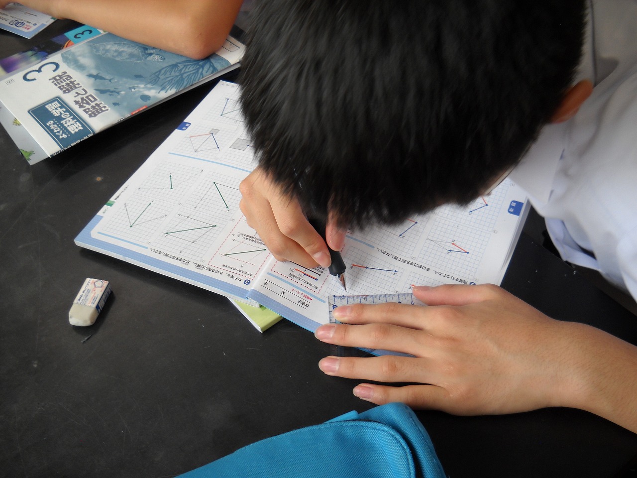 3年生は国語と理科の授業です。国語は名作「故郷」。思わず「ルンちゃん」と答えを言ってしまった本間先生が笑いを誘い緊張がとけました。理科は振り子の実験と考察です。実物を用いて説明をすることで、言おうとしてることがより分かりやすく伝わりますね。