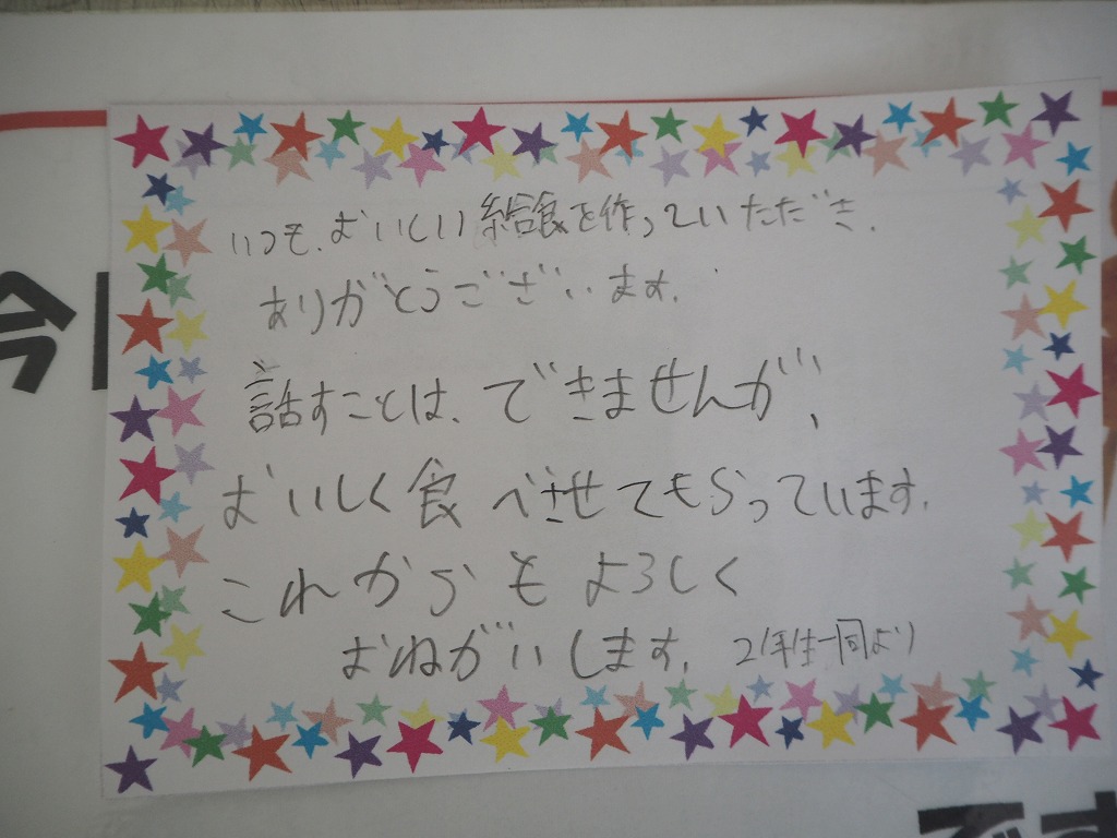 加えて今回は、給食調理員さんにも贈っていただきました。調理員さんたちも,後藤さんの心遣いに感激をしていました。ありがとうございました。