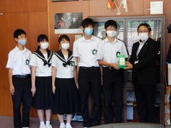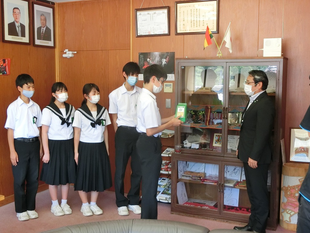 昨年度後期役員と今年度前期役員が中心となって取り組んだ緑の羽根募金。臨時休業中の登校日、再開後の朝の時間を使って、全校生徒、全教職員に募ったものです。役場経済課のはからいで、村上町長さんに直接手渡す機会をつくっていただきました。5人の役員が町長室で、町長さんと親しくお話をしながら、貴重なひとときを過ごしました。