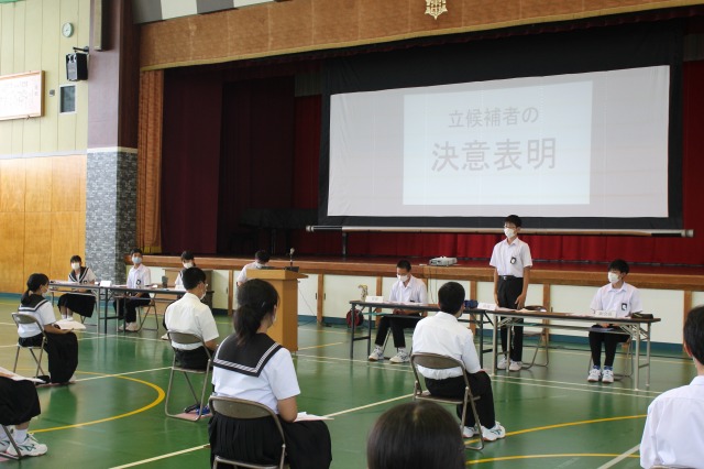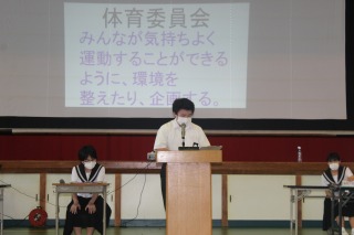 月曜朝礼で委員長の任命をしました。生徒総会と順番が逆になってしまいました。呼名に対する返事がどの委員長も素晴らしくて、やる気を感じる任命式になりました.気持ちが良かったです。スピーチもスタートしました。今年から、スピーチ対する質問や感想を述べる時間が設けられました。生徒会執行部の二人のモデルスピーチです。レベルアップさせようという気持ちもうれしいです。