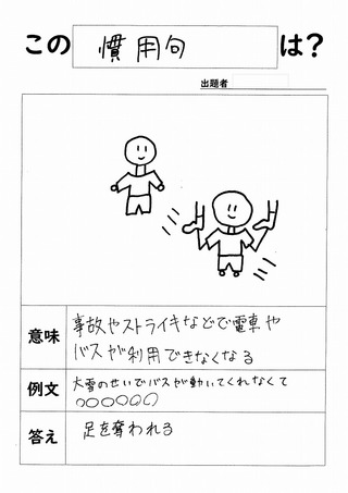3年生の国語、「ことわざ・慣用句・故事成語」の学習で、クイズを作りました。職員で作品を見ながら、一時大いに盛り上がりました。どれも傑作でしたが、特に職員に受けた作品を4点紹介します。発想の豊かさ、アイデアの豊富さに感心です。(作成者の名前は伏せてあります。)