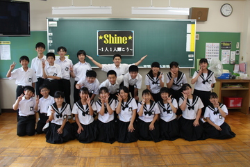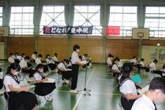 生徒会のスローガンです。朝礼のなかで、新執行部から全校生徒に発表されました。「明るくあたたかいこころをもった東中生が、1つになって前に前に進んでいく」という思いがこもっています。太平洋を流れる暖流「黒潮」のような力強い流れも期待できそうです。