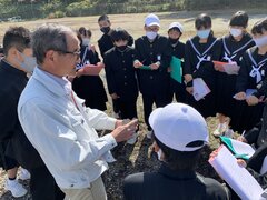 1年生は、社会の学習で桜平遺跡の見学に行きました。桜平遺跡は縄文時代の遺跡で、東栄町の昔の人々の生活について金田さんが、説明してくれました。東栄町では55カ所遺跡が見つかっていることを知りました。昔の人々は、狩りや採集が主で生活していると聞いて大変だと思いました。川の近くに遺跡が多く見つかっており魚を獲っていたと考えられています。私は、漁に使ういしに石垂という名前がついているのが驚きました。昔の人々は東栄町の川を大切にしてくれていたんだなと思いました。なので、私たちも大切にしたいと思いました。